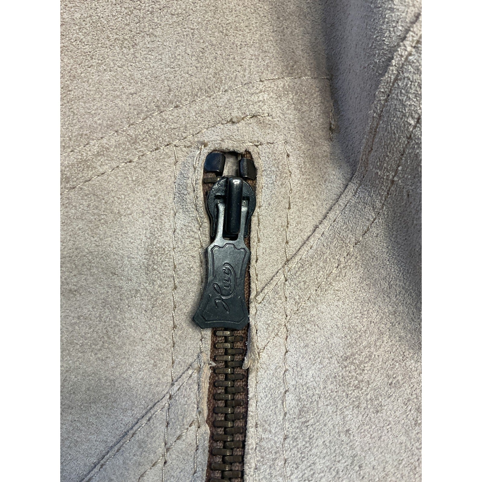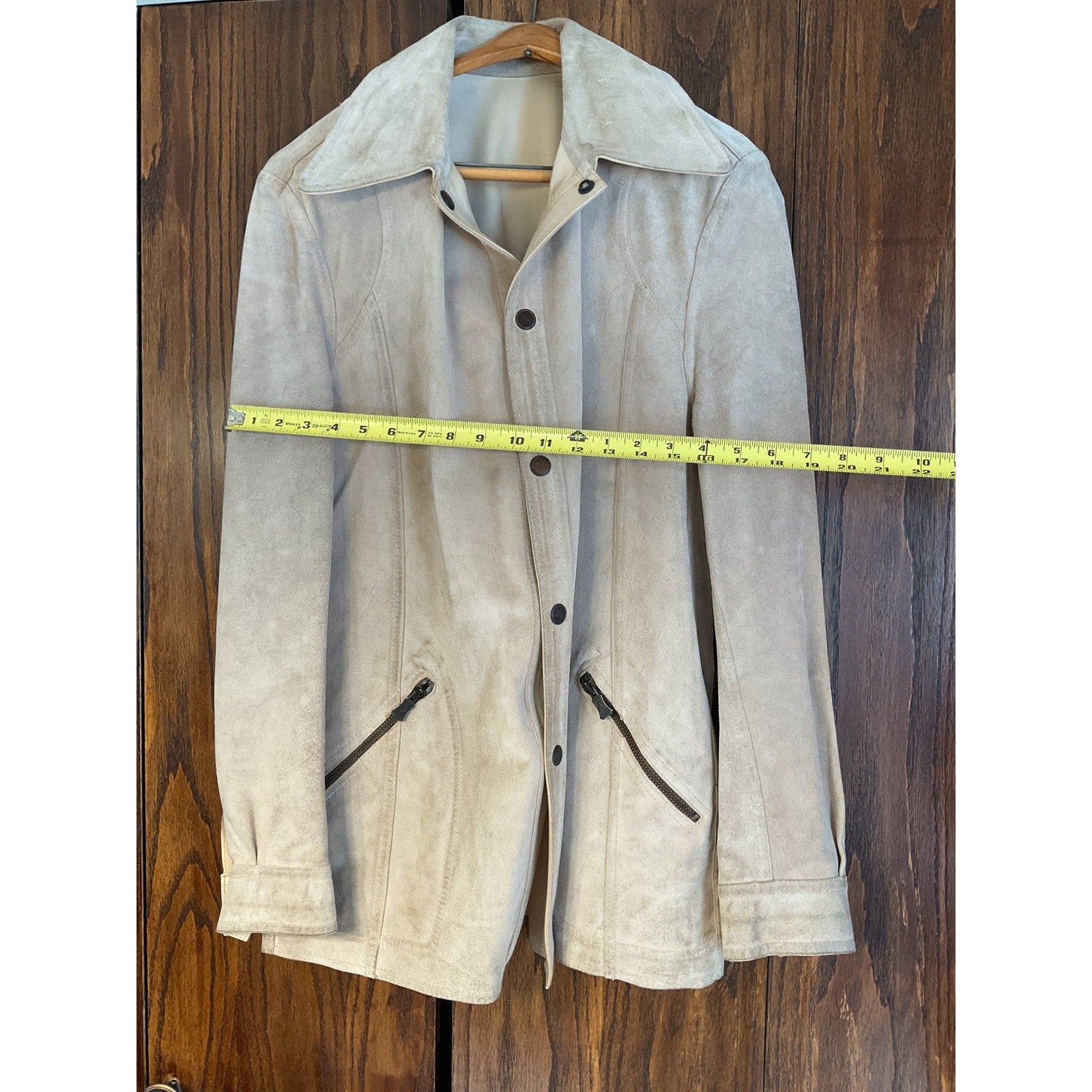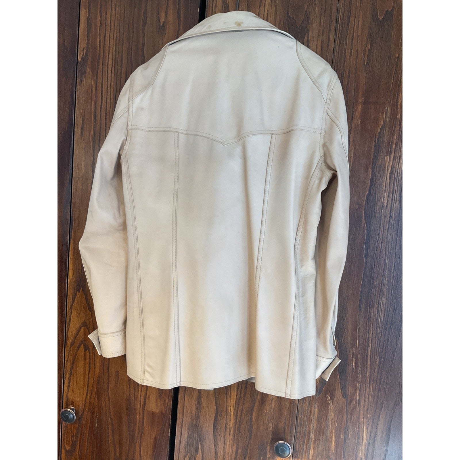 This Cream Leather Outerwear is Made In Sweden. The Beige Jacket has metal hardware. There are Metal Snaps down the front. This is a used, vintage item, and there is wear and tear.